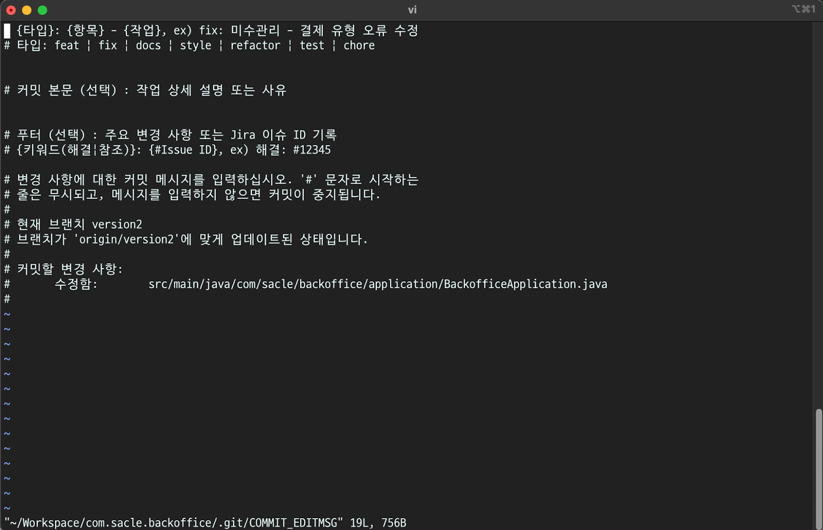 커밋 메시지 작성 후 저장하면 주석이 제거되고 커밋 메시지만 저장됩니다.