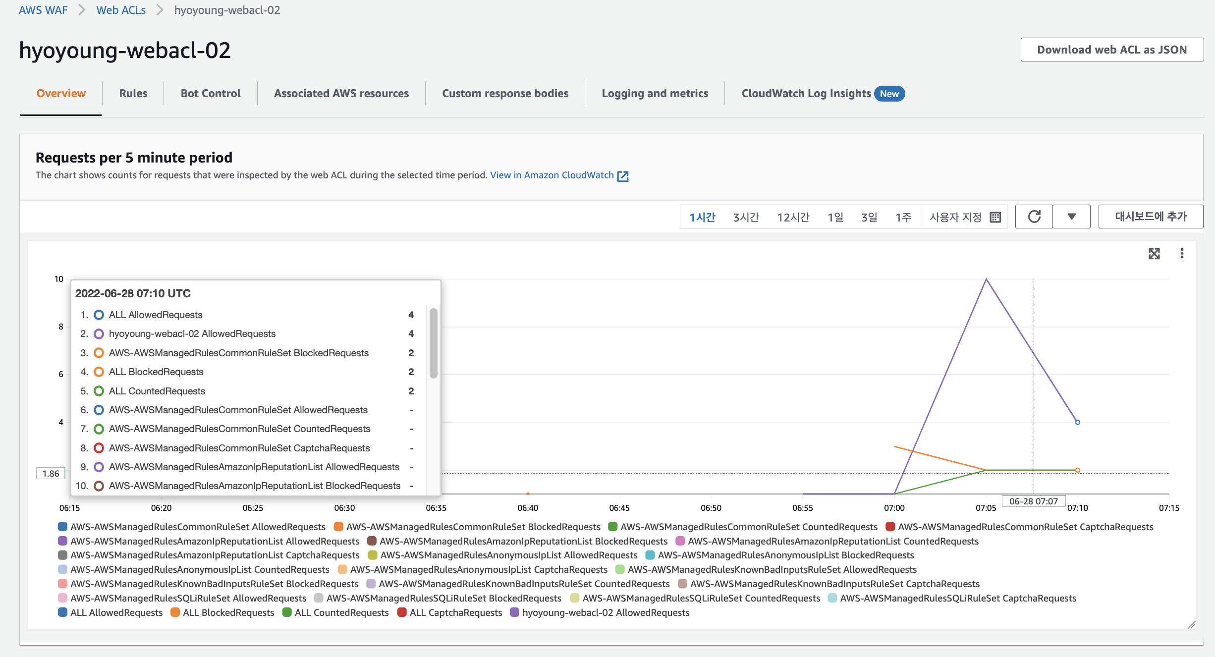 AWS WAF ► Web ACLs 대시보드에서 접속/차단 내역을 모니터링할 수 있습니다.