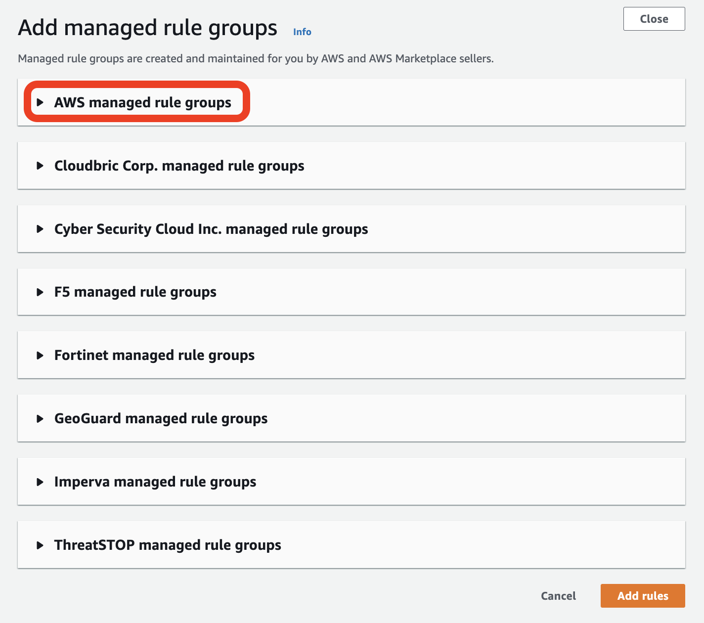 여기서는 AWS에서 사전 정의한 룰을 추가하기 위해 Add managed rule groups를 선택합니다.