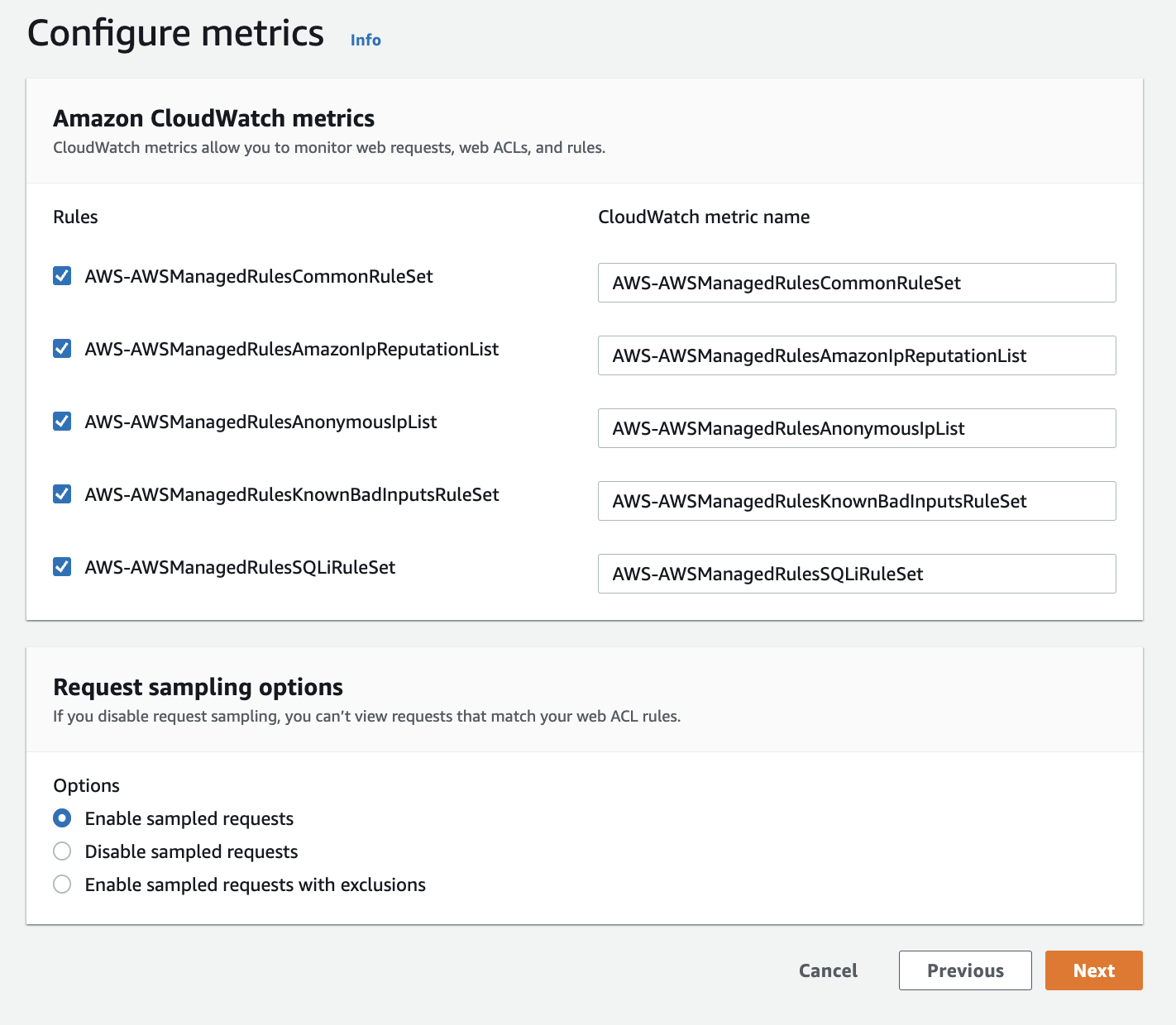 Web ACL의 이름을 입력하면, CloudWatch metric name이 Web ACL 이름과 동일하게 기본값으로 입력됩니다.