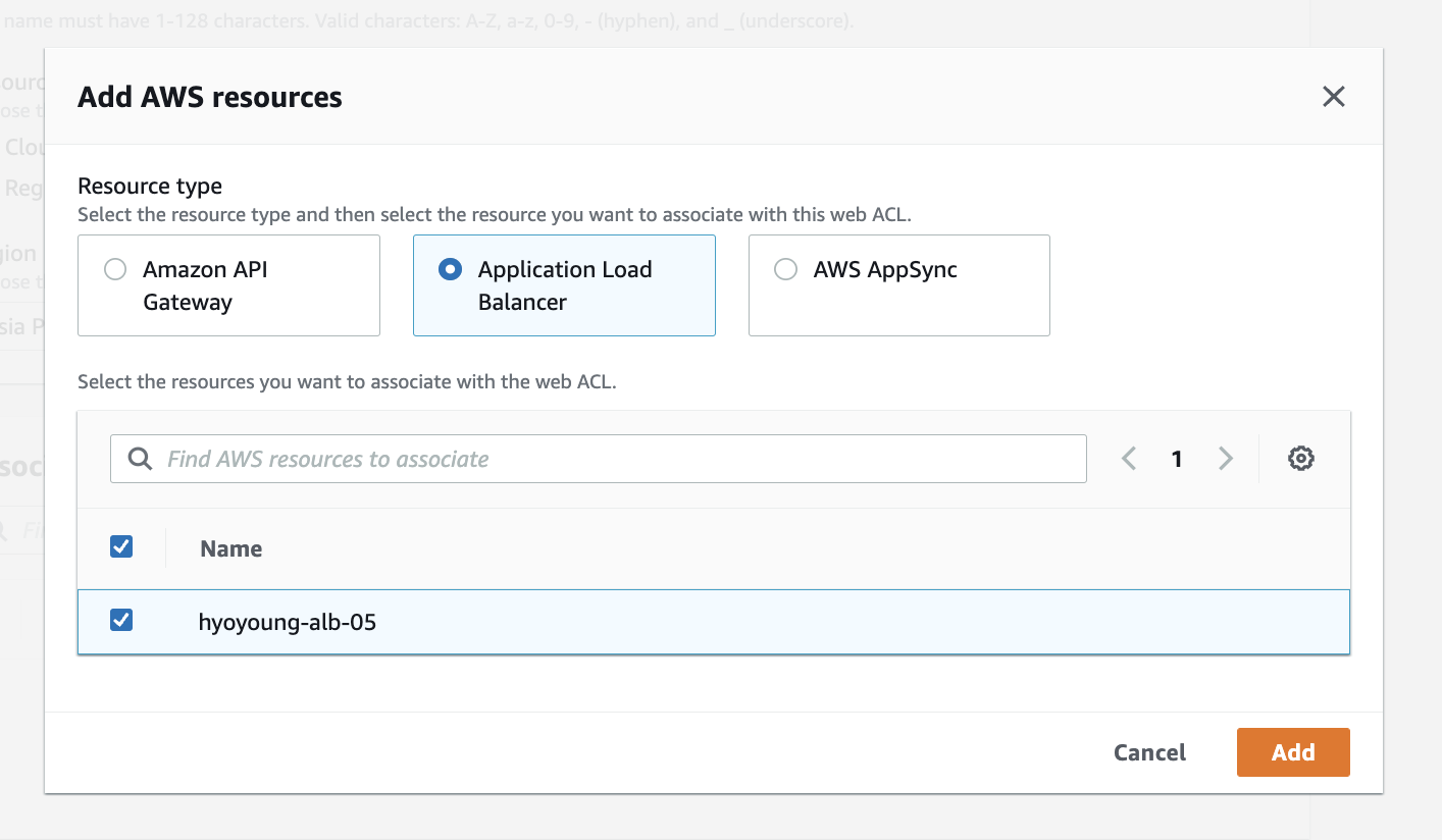 WAF를 적용할 리소스를 선택합니다.