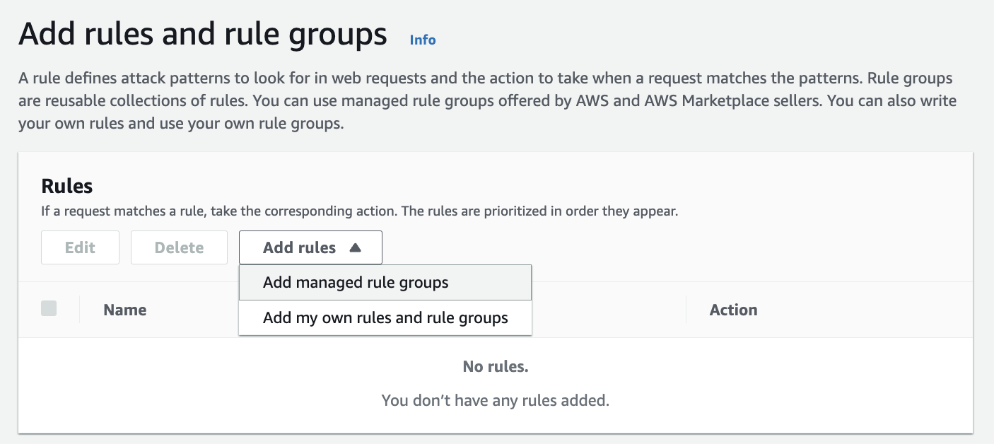 여기서는 AWS에서 사전 정의한 룰을 추가하기 위해 Add managed rule groups를 선택합니다.