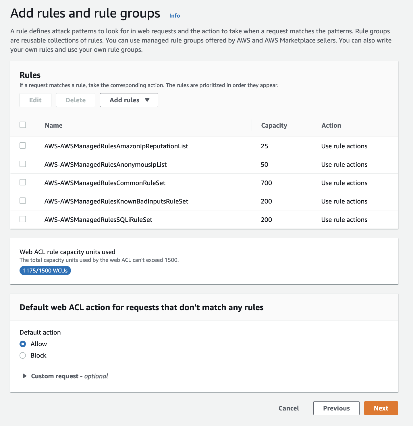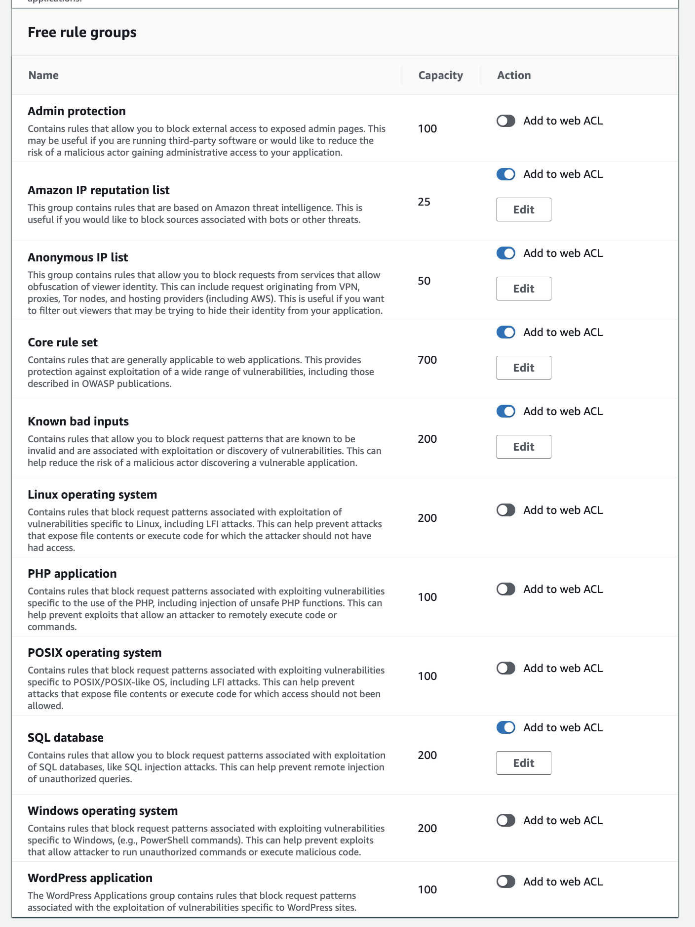 ✍️ 예전의 WAF1에서는 최대 10개의 rule을 선택할 수 있었으나,