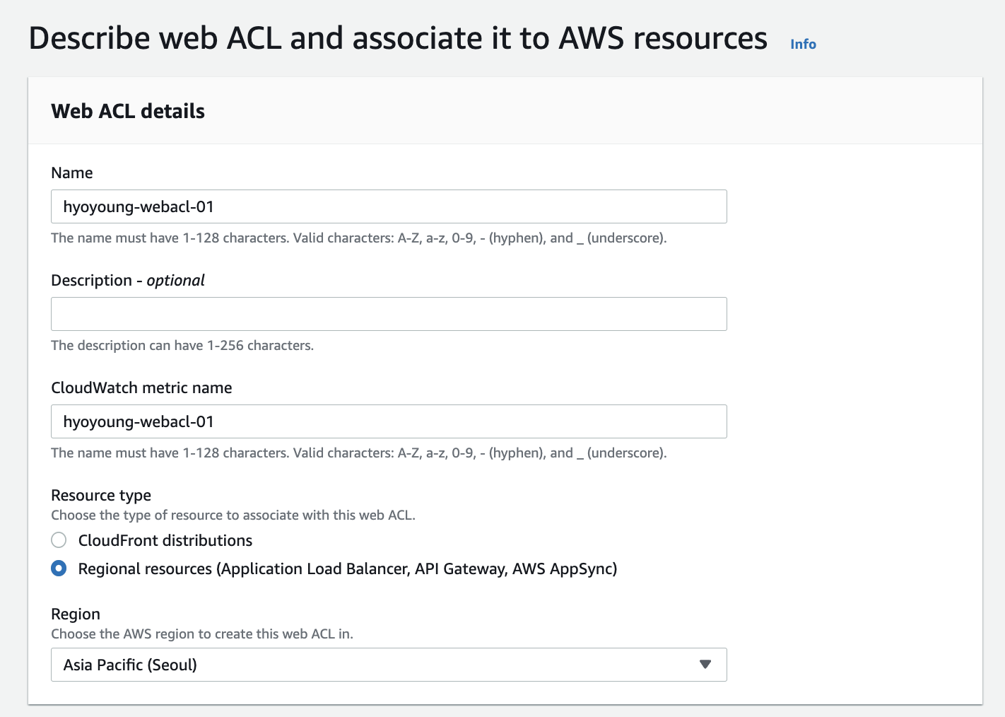 ALB에 WAF를 적용하려면 Resource type은 Regional resources를 선택하고