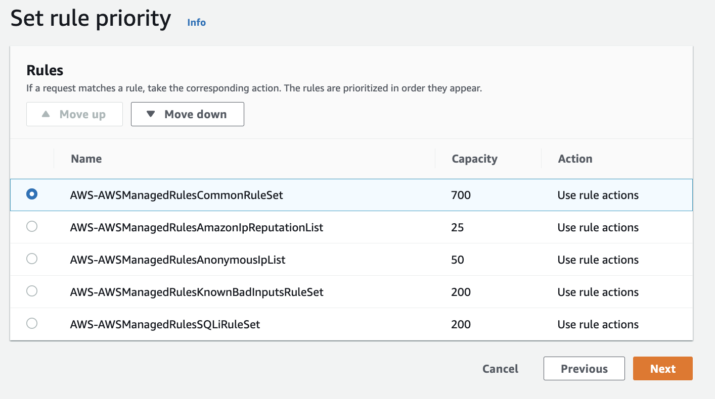 선택한 rule 중에서 AWSManagedRulesCommonRuleSet의 우선순위를 제일 위로 변경합니다.