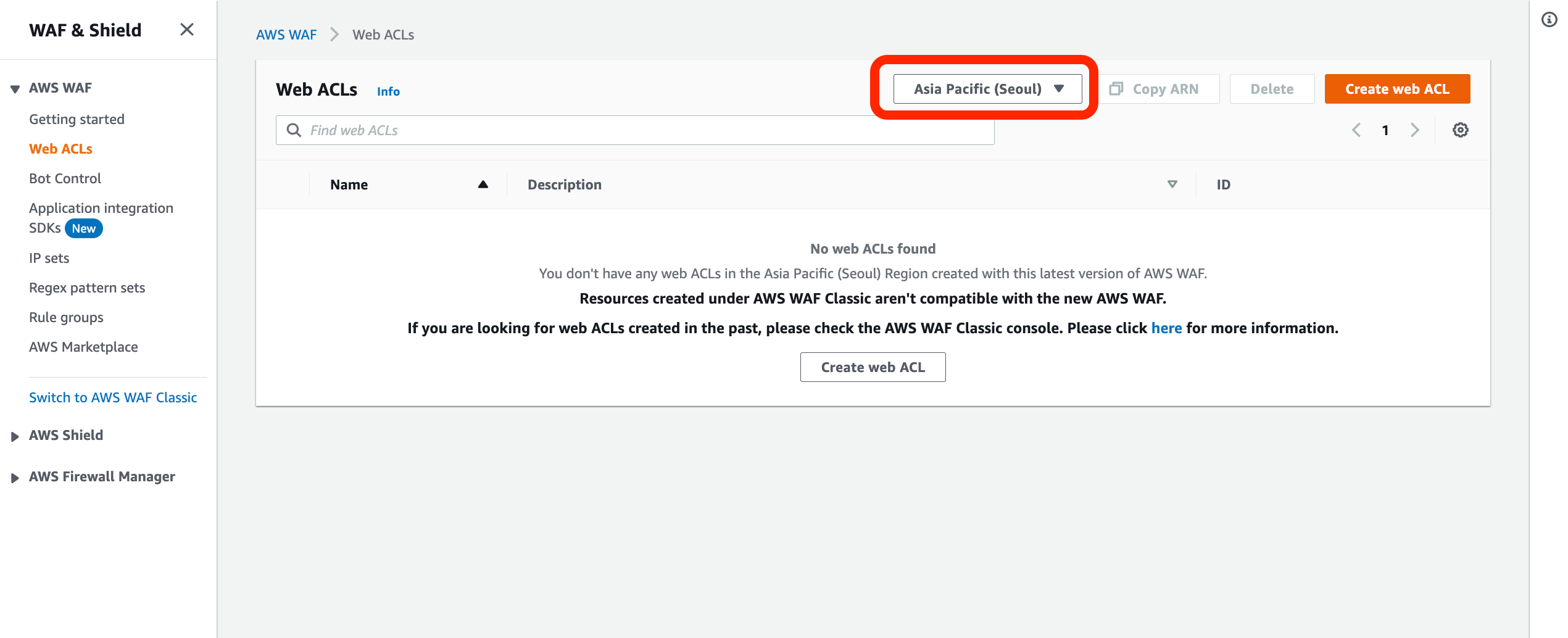 Region을 Asia Pacific(Seoul)로 맞춘 후, Create Web ACL을 누릅니다.