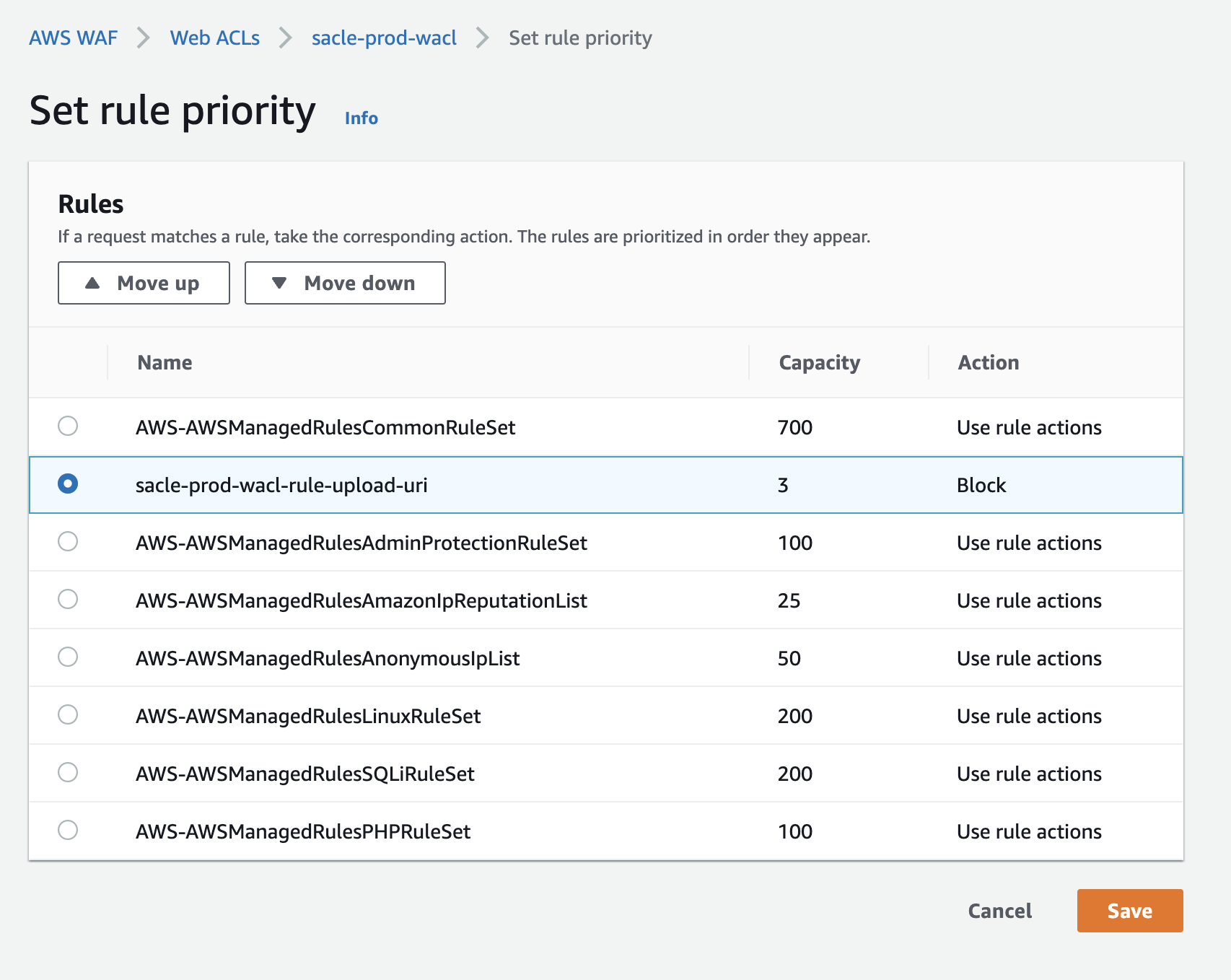 우선 순위에서 새로 생성한 규칙을 AWSManagedRulesCommonRuleSet 아래로 이동 시킵니다.