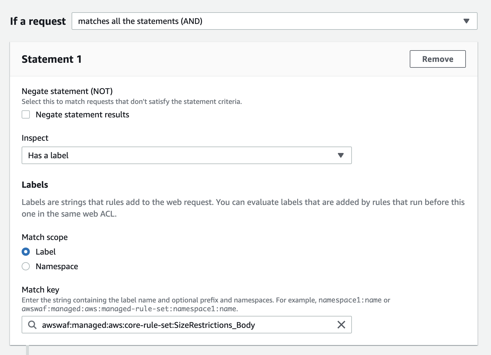 Match key - awswaf:managed:aws-core-rule-set:SizeRestrictions_Body 선택합니다.