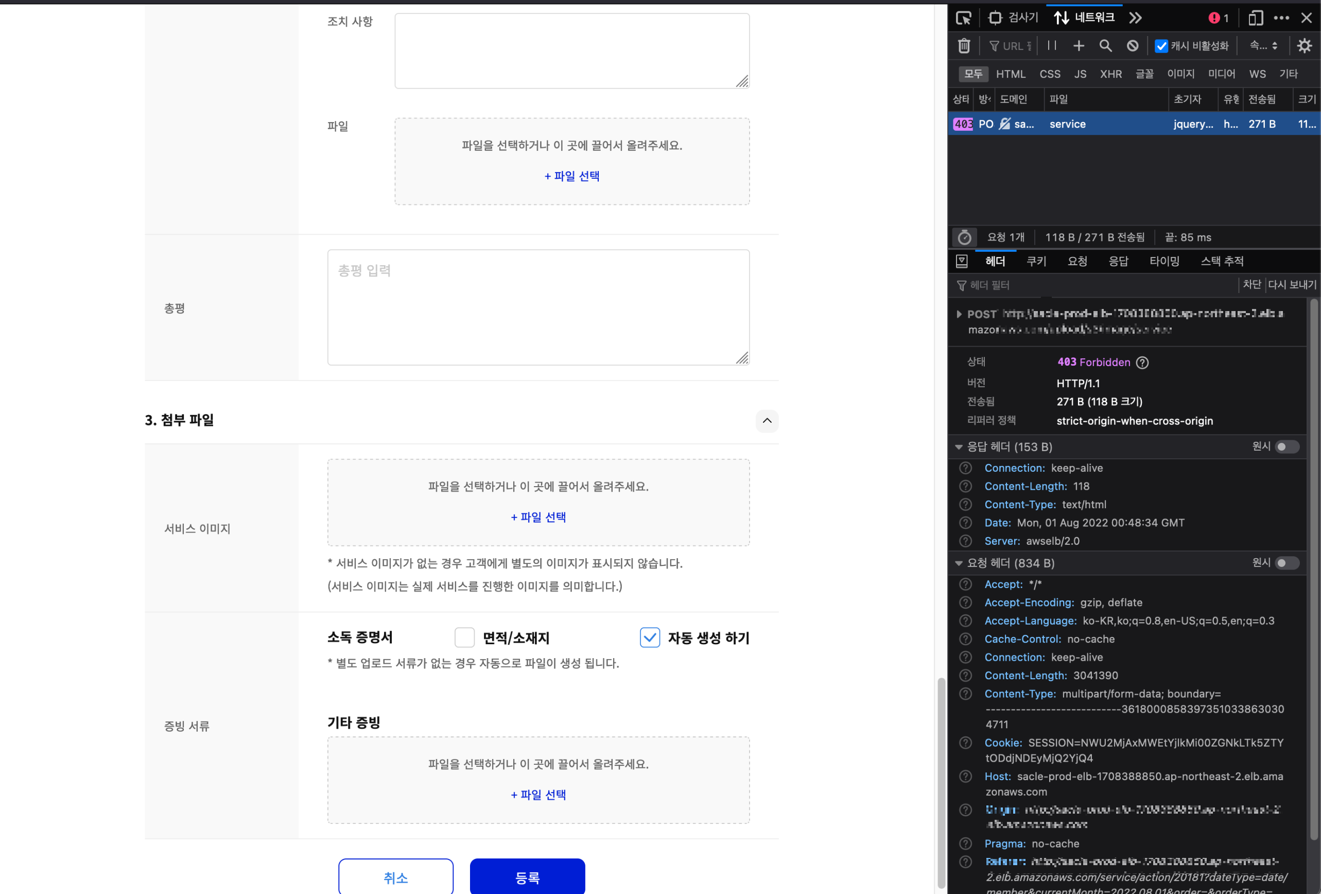 EC2 인스턴스의 Web App.에 Multi-part로 파일 업로드 시도 시 403 Forbidden 발생하여 조치한 내용입니다.