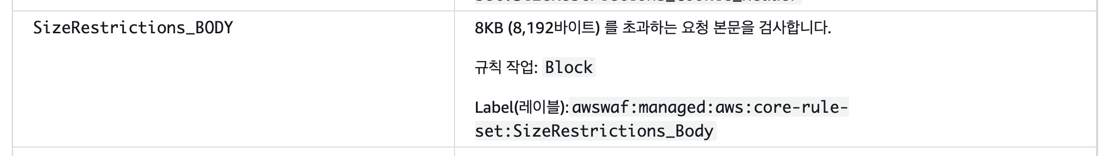 차단된 규칙은 AWSManagedRulesCommonRuleSet 규칙 그룹의 SizeRestrictions_BODY 규칙입니다.