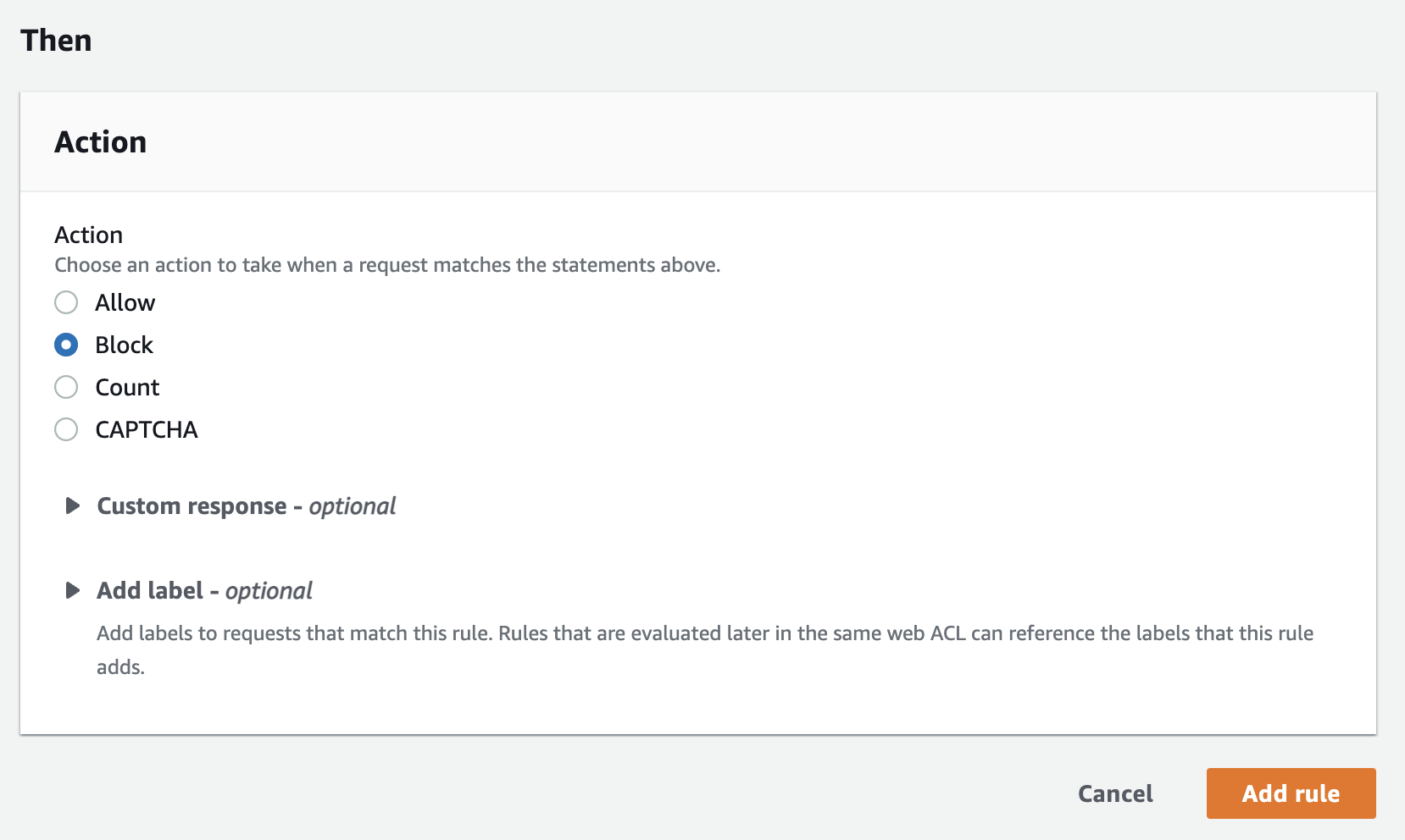 Action - Block을 선택하고, Add rule 합니다.
