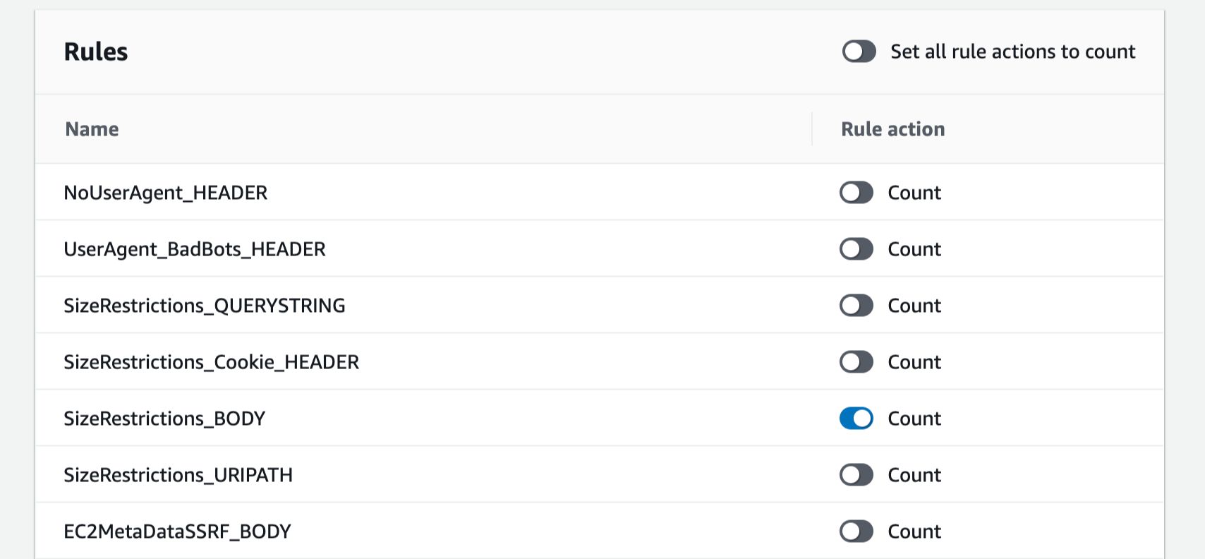 차단이 발생한 SizeRestrictions_BODY 규칙을 count 모드로 설정하고 저장합니다.