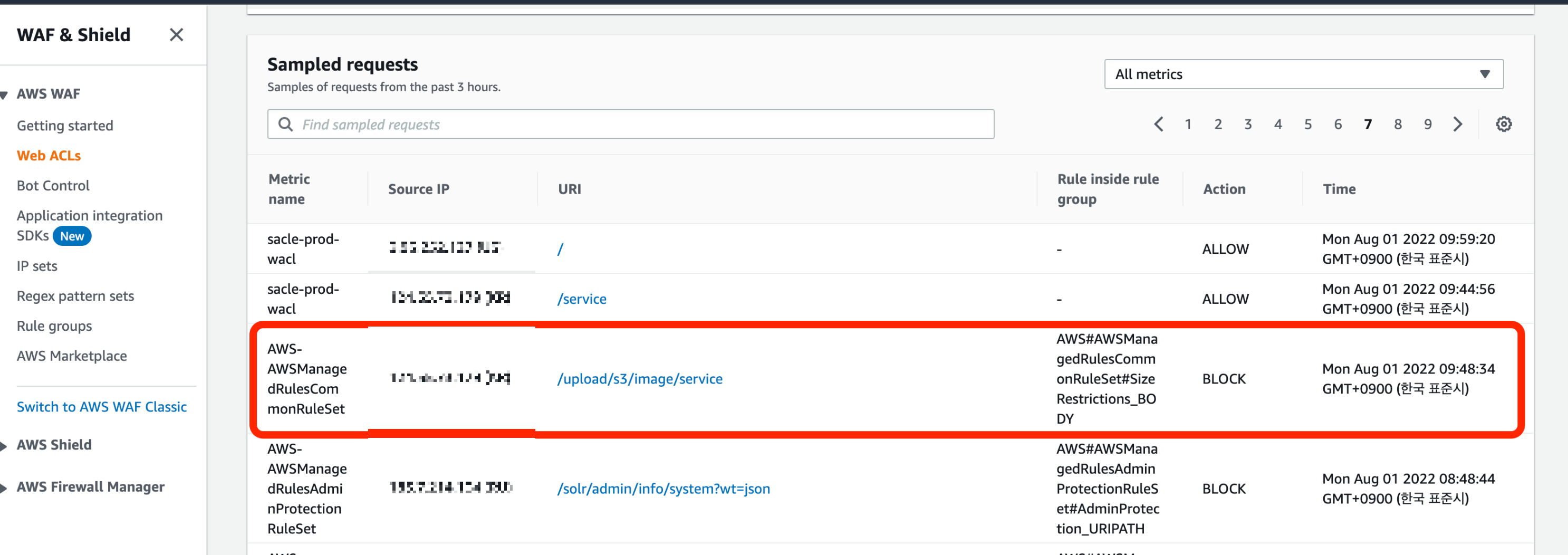 AWF의 Web ACLs 대시보드를 살펴본 결과, 파일 업로드 요청이 403 차단된 것을 확인하였습니다.